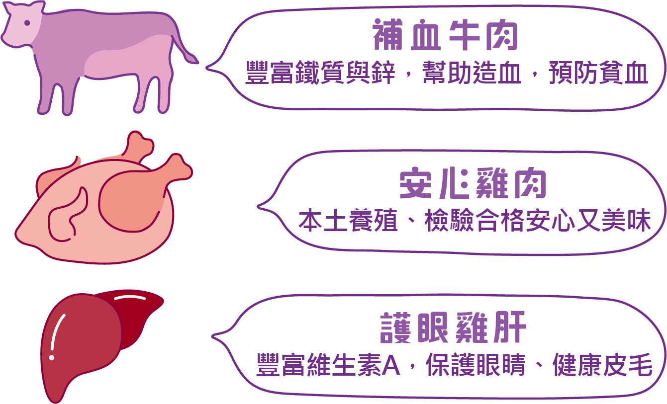 ♦ 嚴選食材:牛肉 、雞肉、雞肝、水