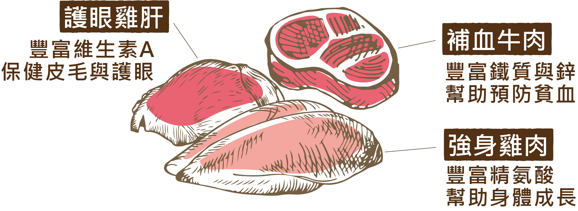 嚴選食材:牛肉、雞肉、雞肝、水